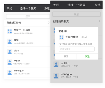 从群成员列表中选择参会人,支持9人同时接入。任意群成员可发起屏幕共享和文档共享。