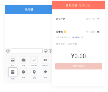 点击加号,选中红包,在顶部栏选择红包类型,输入金额、个数、领取人、祝福语。