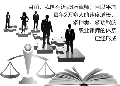 目前,我国有近26万律师,且每年以平均2万多人的速度增长,多种类、多功能的职业律师的体系已经形成。据统计,2013年,全国律师共担任法律顾问45万多家,办理诉讼案件250多万件,非诉讼法律事务81万多件。