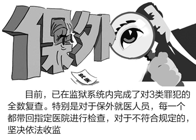 “中央政法委发文要求,进一步确保司法公正,严格减刑、假释、暂予监外执行。对此,司法部在要求各地严格执行的同时,在监狱系统内完成了对3类罪犯的全数复查,特别是对于保外就医的,每一个都带回指定医院进行检查,对于不符合规定的,坚决依法收监。”