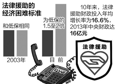 “目前,法律援助的经济困难标准已从低保调整为低保的1.5至2倍。”张苏军说,法律援助条例配套规章日益完善,已有28个省区市出台了地方性法律法规,建立了中央和地方共同分担的法律援助经费保障体制。10年来,法律援助财政投入年均增长率为16.6%,2013年中央财政达16亿元。
