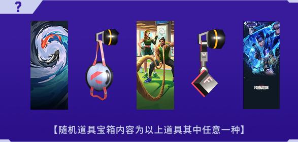 随机道具宝箱内容为以下道具其中任意一种:挂饰-阳光微笑、挂饰-瑞思拜、卡面-战绳燃脂、卡面-红鳞松叶、卡面-列阵以待,系统会根据玩家背包中还未拥有过的道具进行随机选择下发。