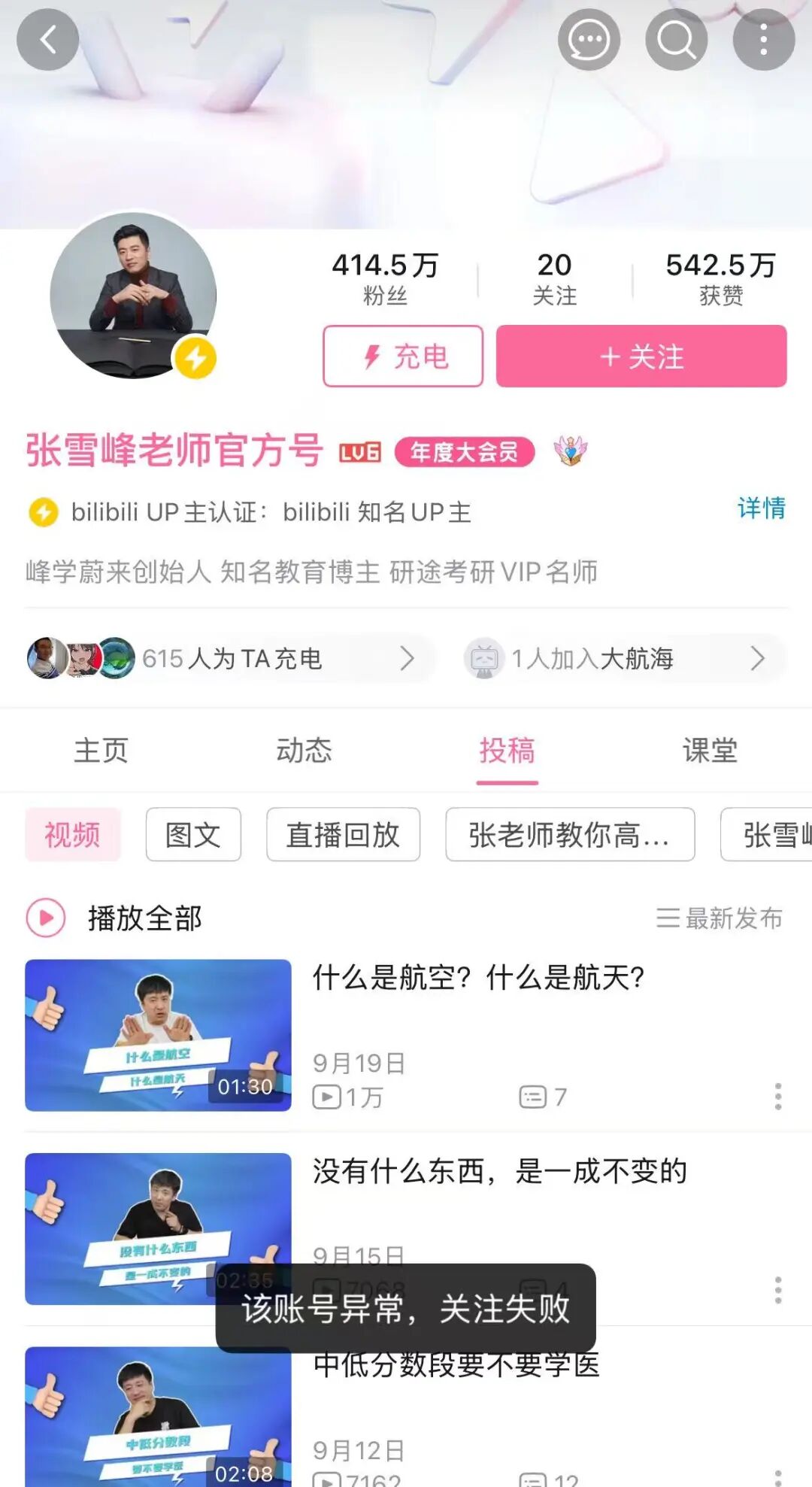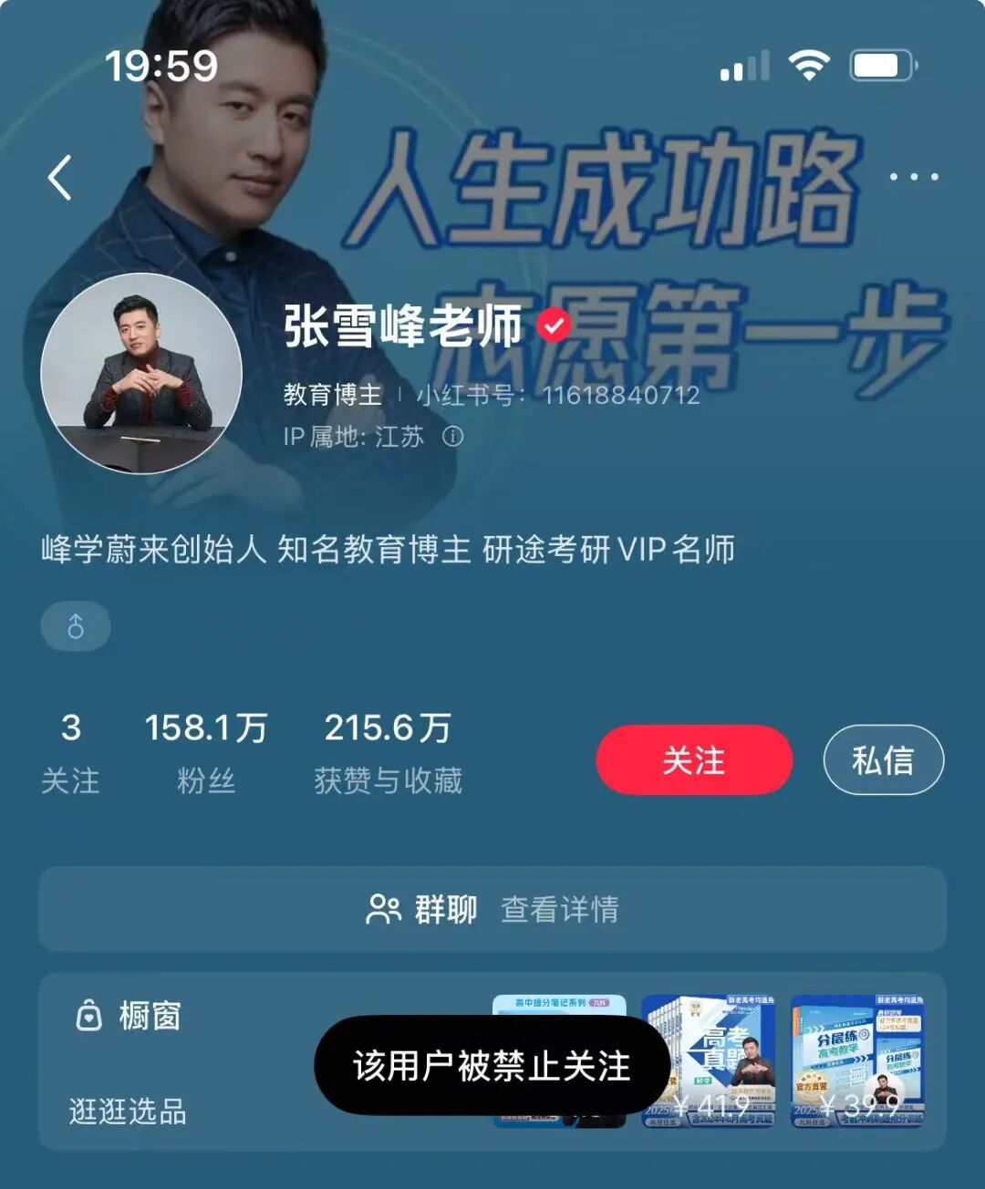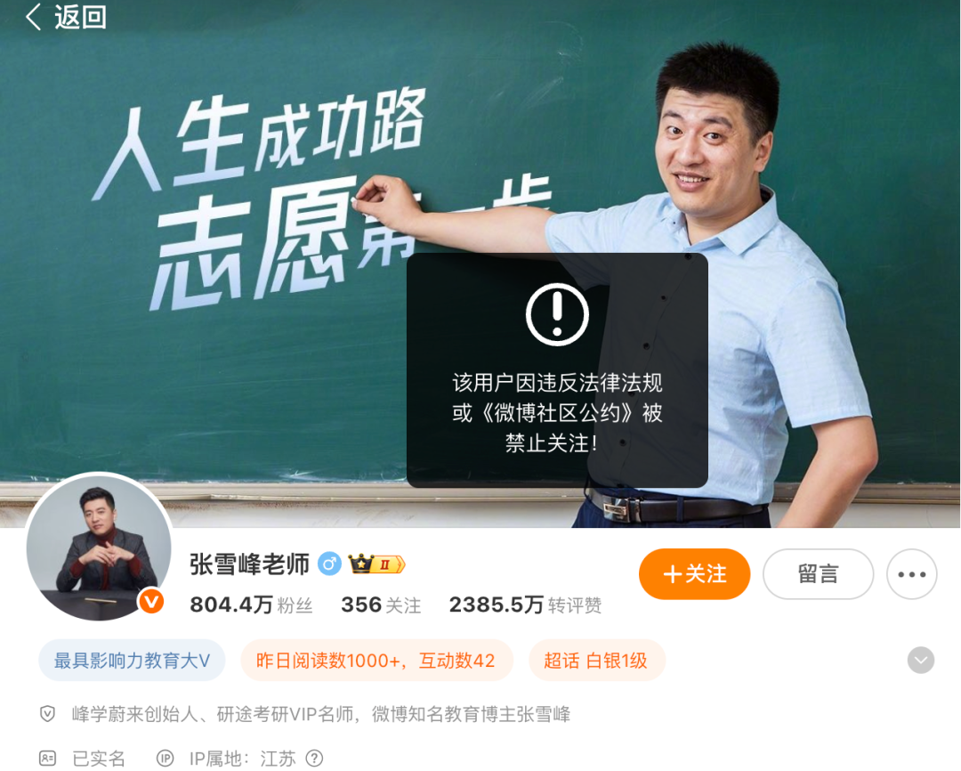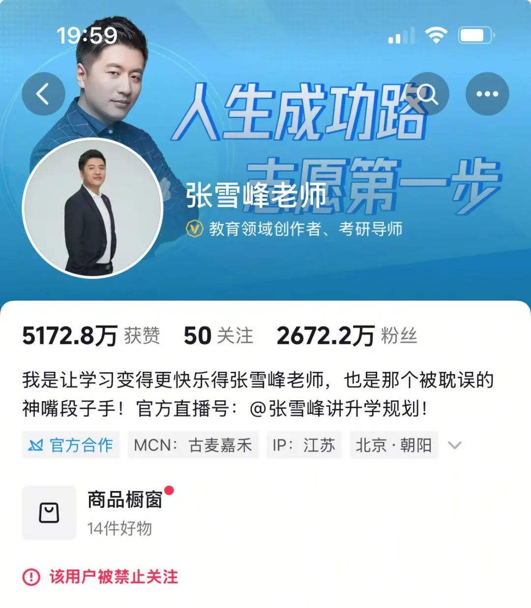 9月24日,张雪峰账号在微博、小红书、抖音和B站平台(以上四个平台合计粉丝超4000万)均被禁止关注。