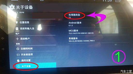 车机加电(不要启动发动机),点击“设置”——“关于设备”,如图,如果处理器是T3,继续阅读以下文档,向后操作,否则,取消本次操作;