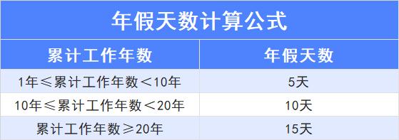 • 职工累计工作已满1年不满10年的,年休假5天;已满10年不满20年的,年休假10天;已满20年的,年休假15天。国家法定休假日、休息日不计入年休假的假期。