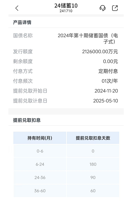 例如2024年10月的凭证式储蓄国债,期限五年,票面利率2.25%,计息方式: