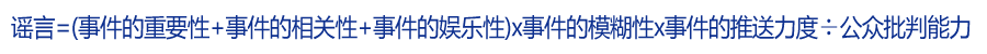 另外,我还加入了一个事件的推送力度,含有两个层面的意思。第一个层面,比如一些营销公司雇佣大量水军发布谣言信息,甚至会在转发过程中,给转发者提供有偿服务,通过这样大力度的推动,加速谣言传播。第二个层面,宽泛地理解事件的推送力度,比如一个谣言信息经过网络大V或者意见领袖、专家之口传播,可信度会更强。所以我给出的新的谣言公式是,事件的重要性,加相关性,加娱乐性,整体乘以事件的模糊性,再乘以事件的推送力度,最后整体除以公众的批判能力。公众的批判能力越强,谣言的传播力度越弱。