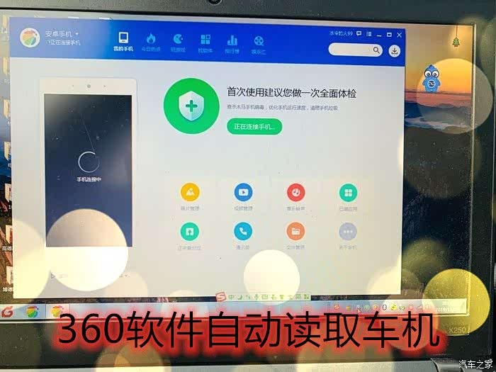 另外就是你的电脑需要提前下载一下360手机助手然后连上WIFI,确保电脑的电充足,用刚才准备的TYPE-C线,一端连接电脑一端连接到扶手箱里边的TYPE-C的接头上。