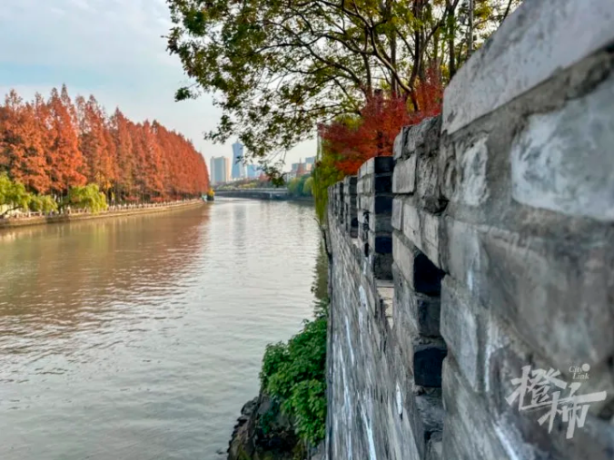 这一路,运河边挺拔的杉树,形成一片红色的“围墙”。