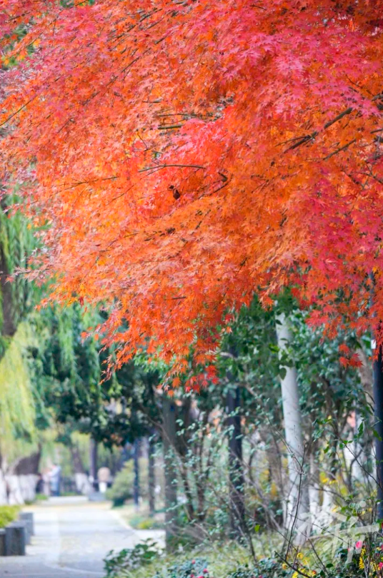沿途数不尽的公园,绿树成荫,四季景色各异。这个时节,枫树正红,阳光下洒下灵动的红光。