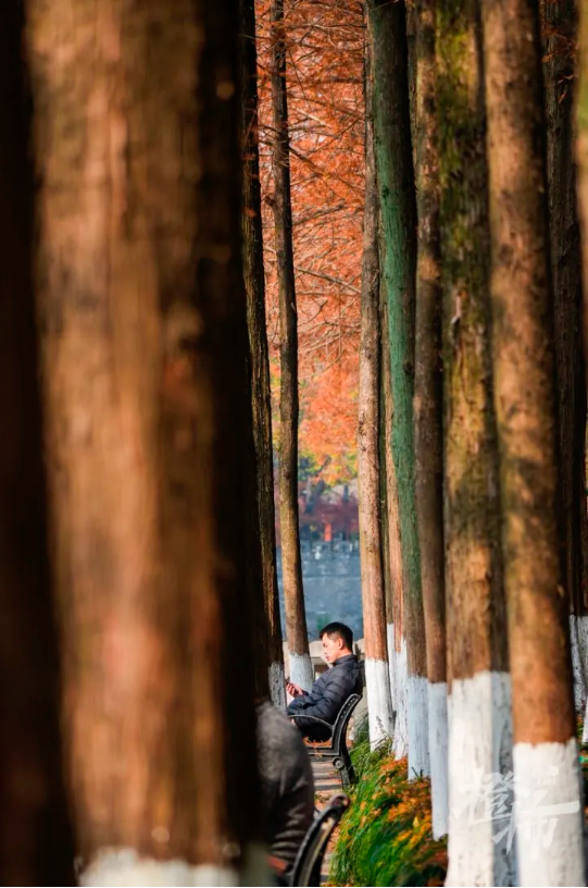 在潮王桥北东线,也是杉树最红的季节。行走在河岸上,如同在树林中穿行。