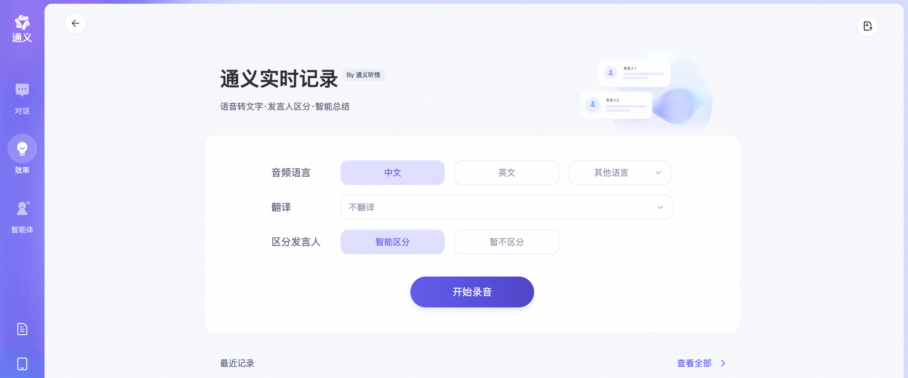 第一步:进入通义效率TAB(https://tongyi.aliyun.com/efficiency/home),点击开启实时记录。