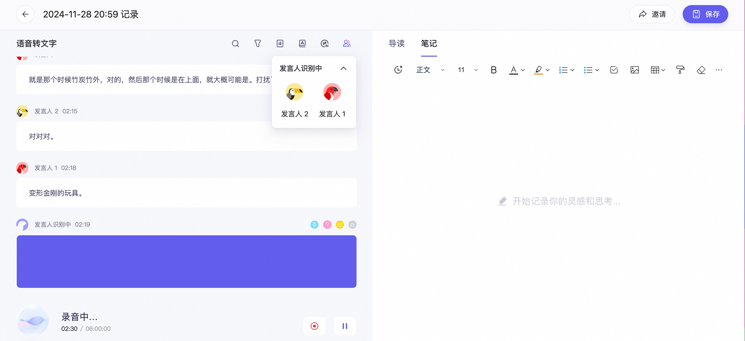 第三步:点击开始录音。录音过程中可以实时查看转写结果,也可以边听边记笔记。