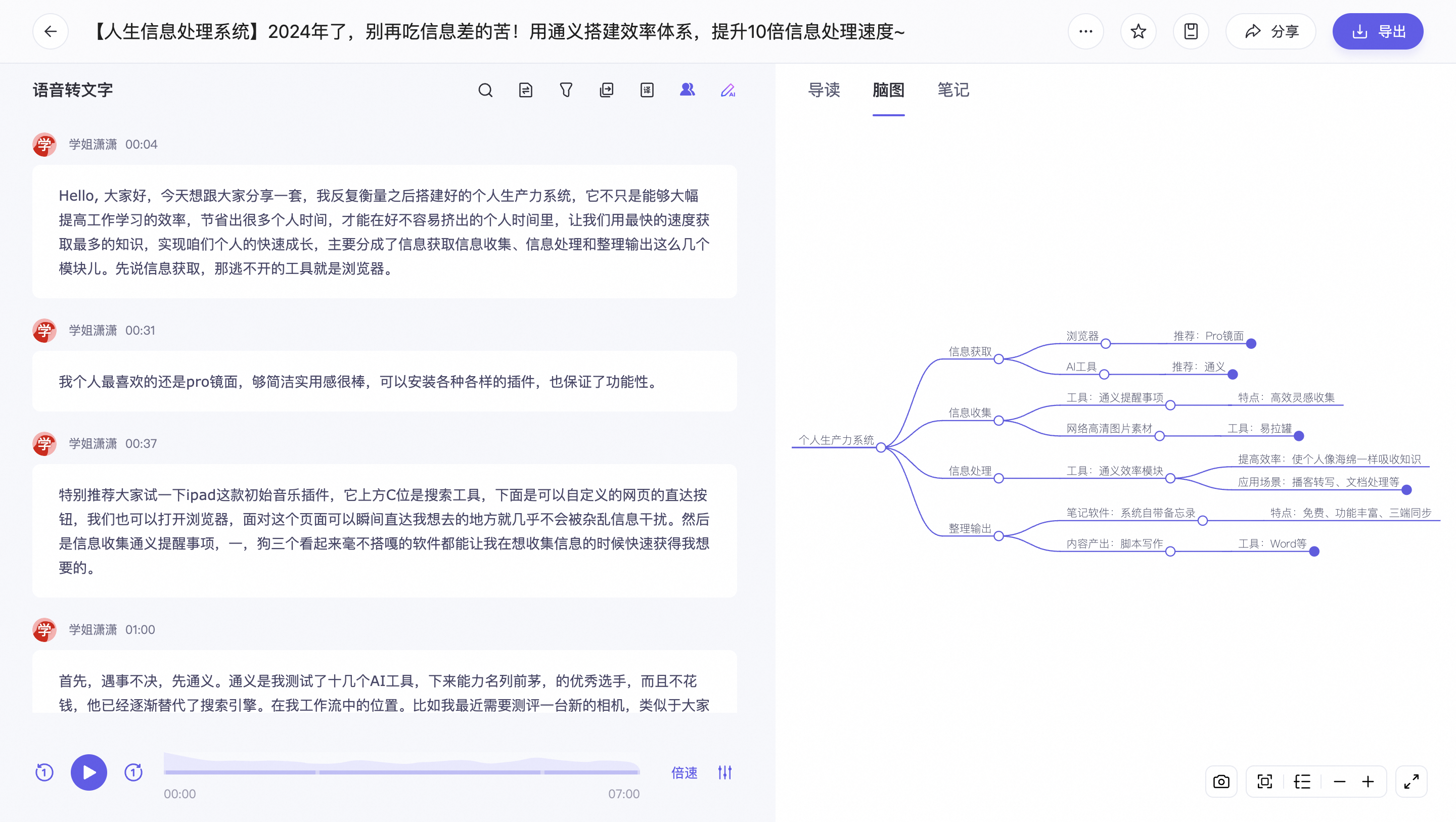 完成实时记录后,可以对转写的内容进行总结,生成AI导读和思维导图,一键完成信息整理。