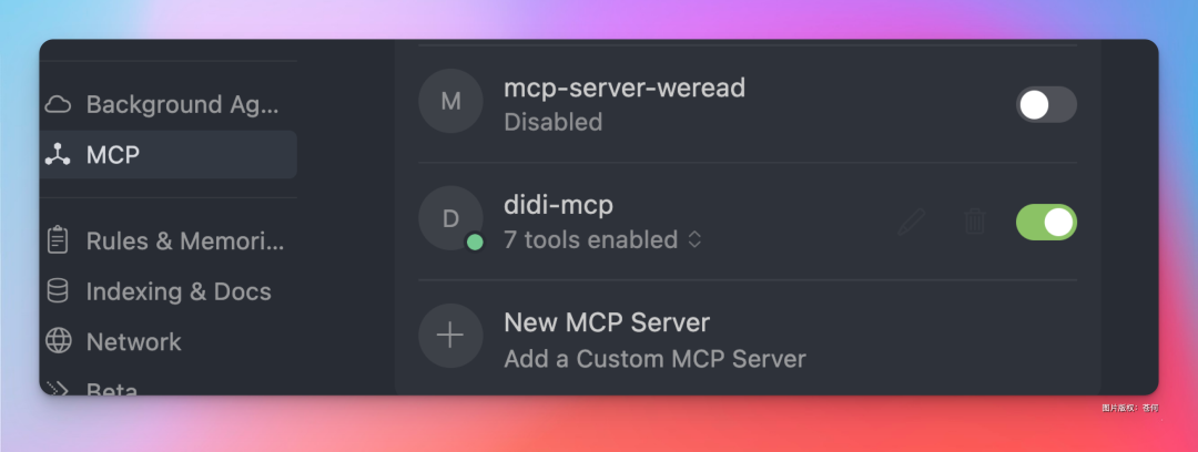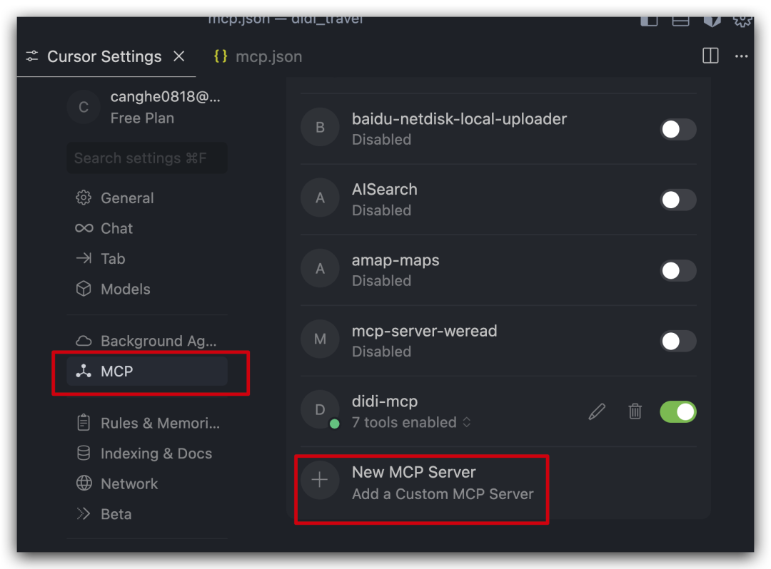 这里以 Cursor 为例,打开 Cursor,点击顶部菜单栏「设置」→「MCP,在 MCP Tools 中点击「New MCP Server」: