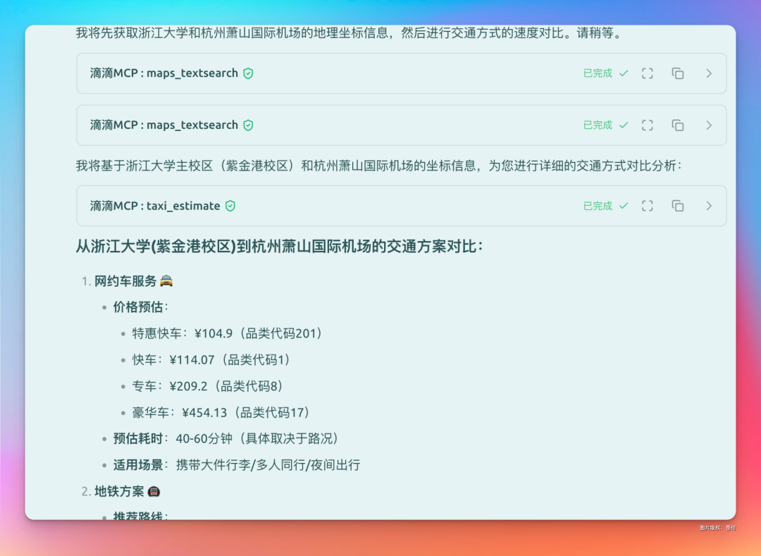 所以,没做好的东西我是不好给大家分享的,但其实滴滴 MCP,还确实有不少有意思的结合场景。