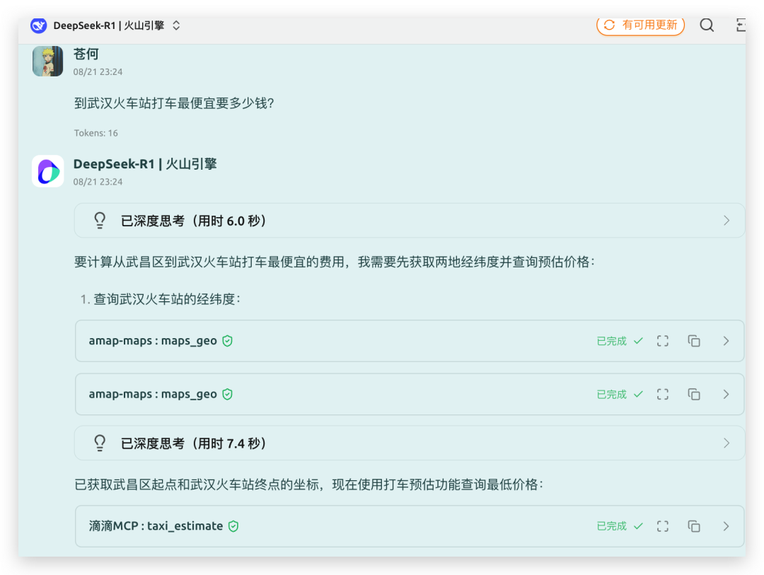 我在 Cherry Studio 中使用滴滴 MCP,就能让它帮我叫车了。
