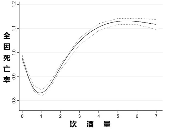 讲到喝酒的益处,最有名的就是展示饮酒与全因死亡率关系的“J”形曲线,即少量适度饮酒(乙醇<5g/天)能够降低全因死亡率,但过量饮酒却会增加全因死亡率,且饮酒量越大,死亡率越高。