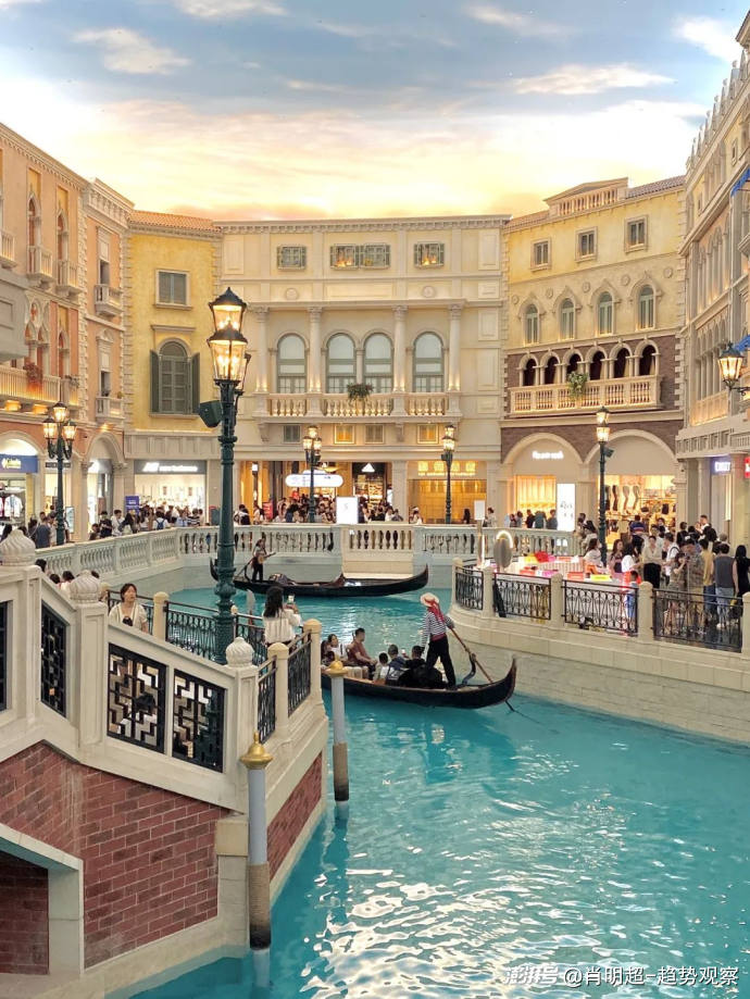 澳门威尼斯人是一个集酒店、博彩、娱乐、购物为一体的商业综合体。以威尼斯水乡为主题,内部有精美的仿真建筑、流动的水道和优雅的贡多拉小船,整个商场被一幅偌大的天幕覆盖,营造出晨昏日出日落的云彩和天色,让游客仿佛置身于威尼斯的浪漫氛围中。