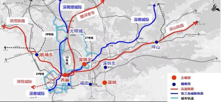 同时,作为深圳市“五主五辅”铁路客运主枢纽的重要组成部分,西丽综合交通枢纽未来将形成“4高铁+2城际+4地铁”的多层级轨道交通网络——