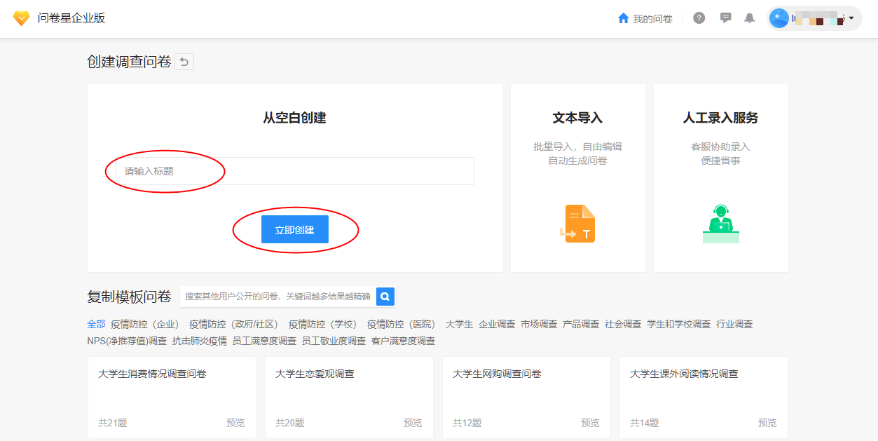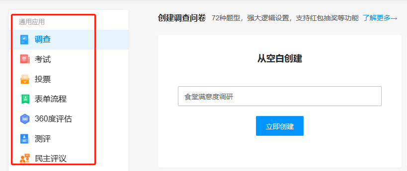 步骤一:点击”创建问卷“,选择创建的问卷类型;