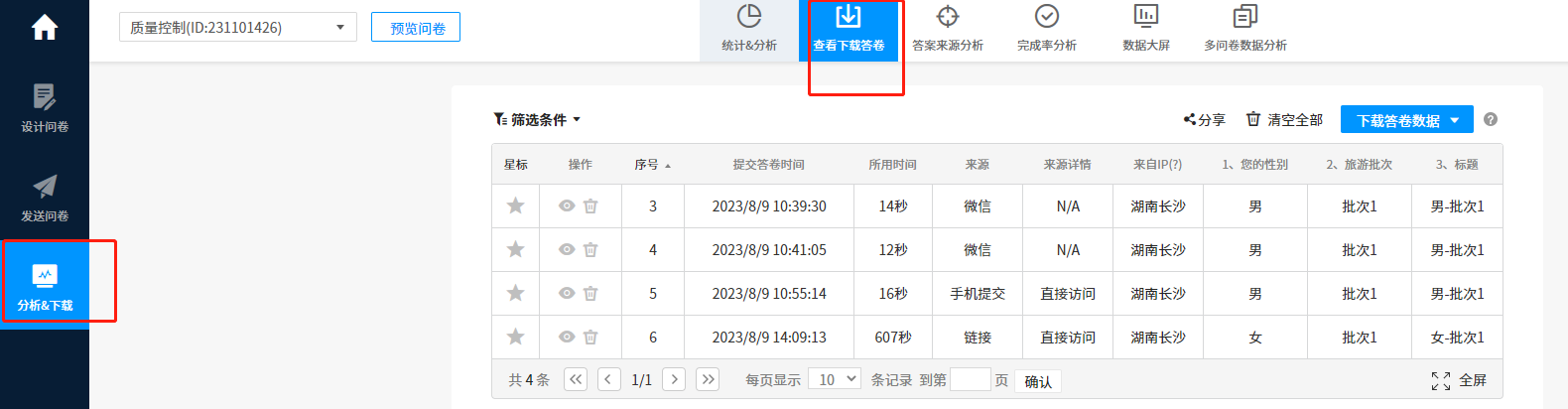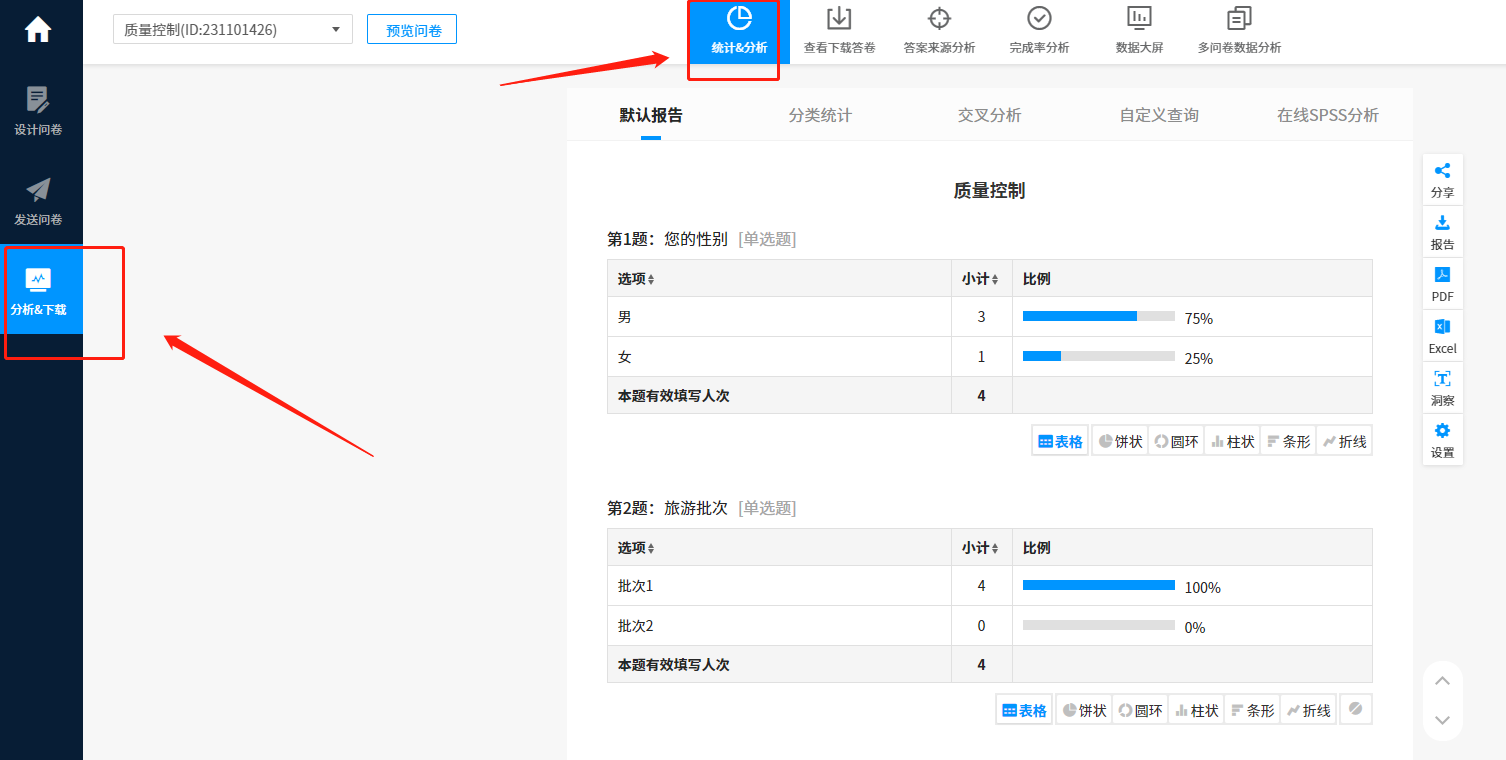 步骤五:有了答卷之后到”分析&下载“》“统计&分析”里面查看统计结果;在”分析&下载“》”查看下载答卷“中可下载原始数据。