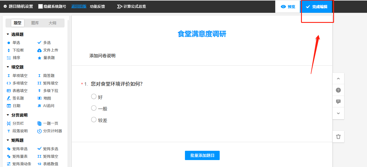步骤三:添加和编辑完所有的题目之后,点击“完成编辑”并发布问卷;
