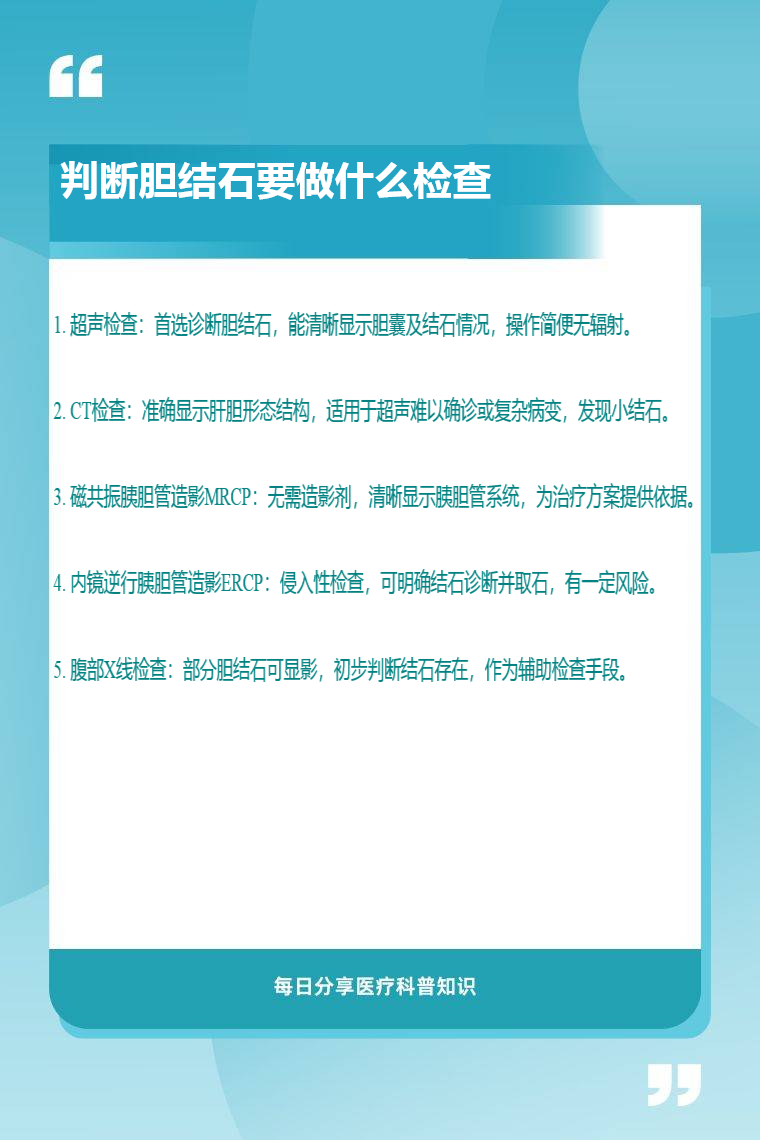 胆结石可通过超声检查、CT检查、磁共振胰胆管造影MRCP、内镜逆行胰胆管造影ERCP、腹部X线检查等检查出来。