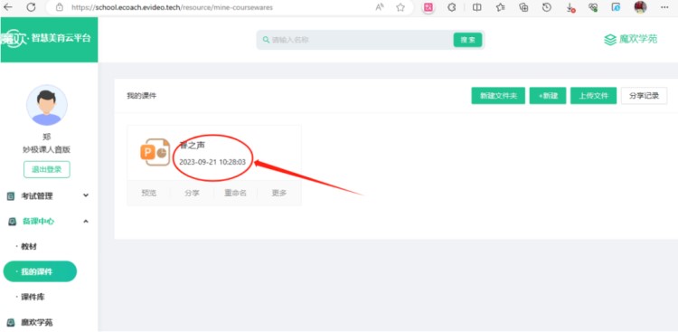 点击左上角“保存”课件,在魔欢音乐教学软件中“我的课件”模块中显示,如下图所示。