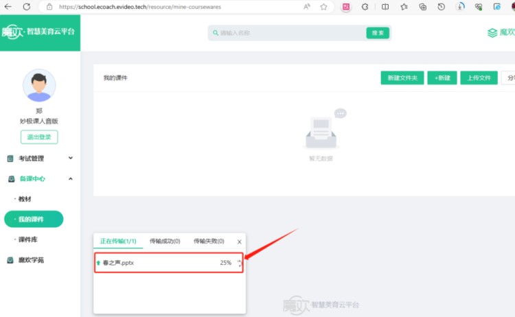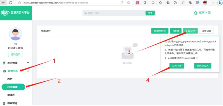 进入备课中心->我的课件,上传文件,文件上传,如下图所示步骤: