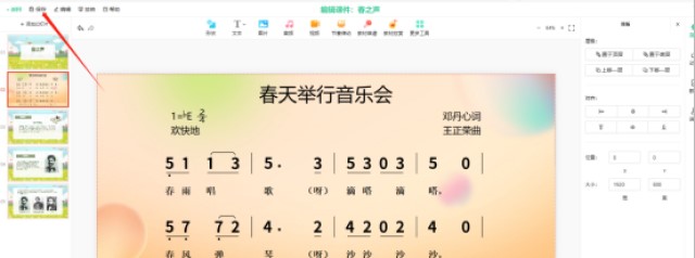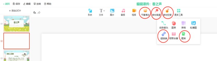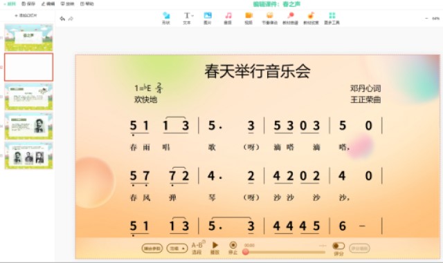 然后可以在中间的工具栏插入系统特色功能,比如节奏律动、教材曲谱、题库等,插入的曲谱是带音频的,在授课过程中直接使用。