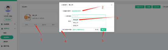 在“我的课件”中,点击“分享”按钮,选择课件关联的章节,分享范围选择“平台公开”,确定之后分享到平台审核员审核。