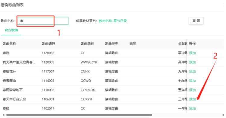 比如插入教材曲谱,可以按歌曲的名字搜索后,点击“添加”,