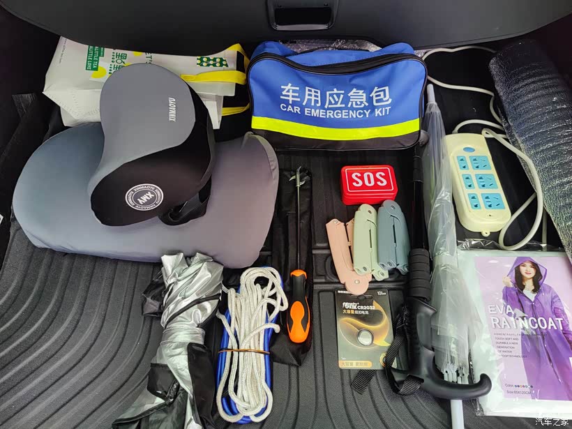 还有些其它配件也陆陆续续补齐了,头枕、腰枕、前档玻璃遮阳伞、车用应急包、小折叠雨伞、车钥匙纽扣电池、雨伞雨衣、登山杖~