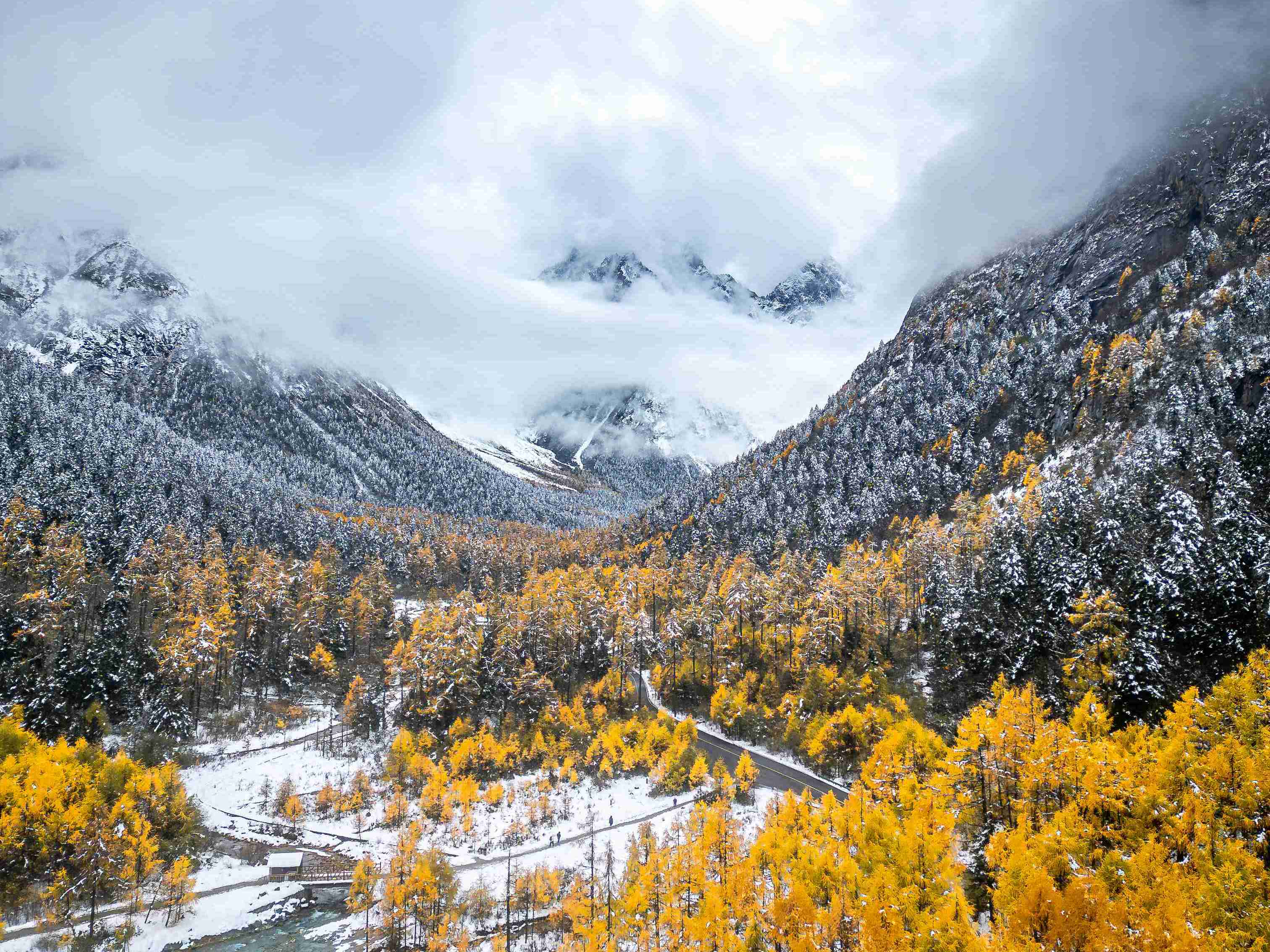 毕棚沟深秋迎降雪 彩林映雪成川西限定秘境