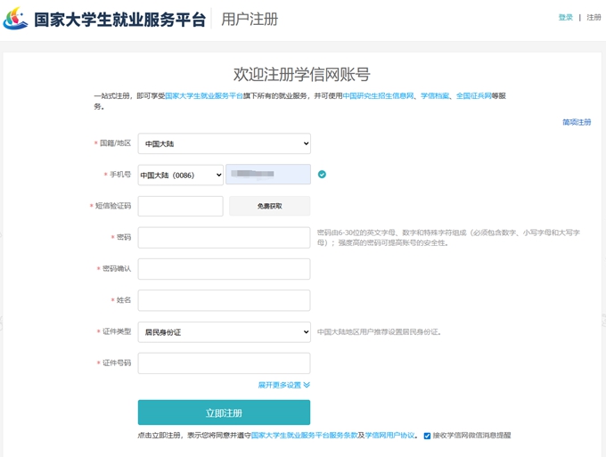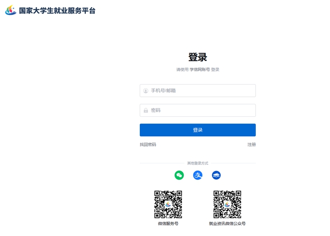 第一步:访问国家大学生就业服务平台网站(https://www.ncss.cn/),点击首页右上方“求职者登录/注册”,进入用户页面,点击“立即注册”,填写注册信息,并点击立即注册,账号即可注册成功。或搜索并关注平台微信公众号“ncssfwh”,登录学信账号,获取求职应聘、就业指导等服务。