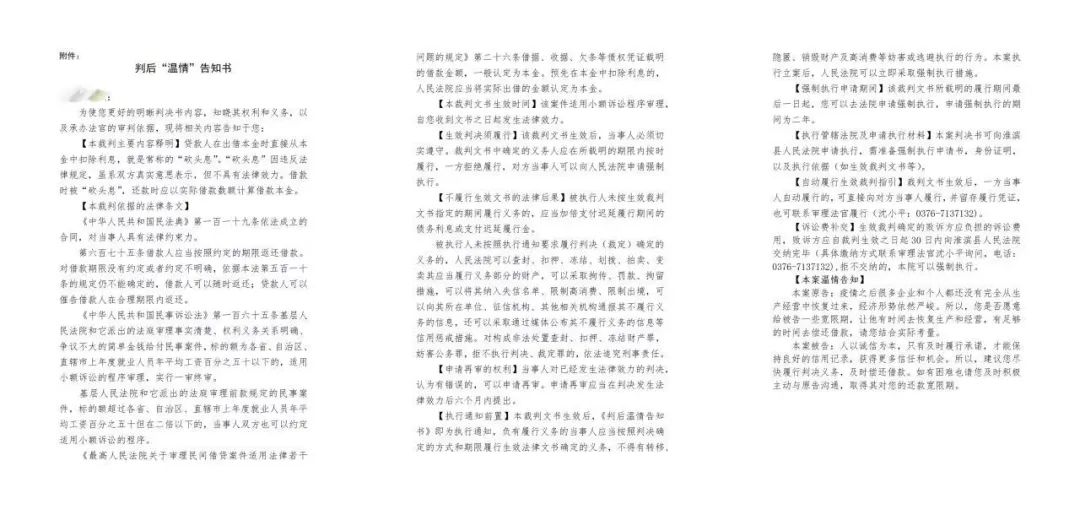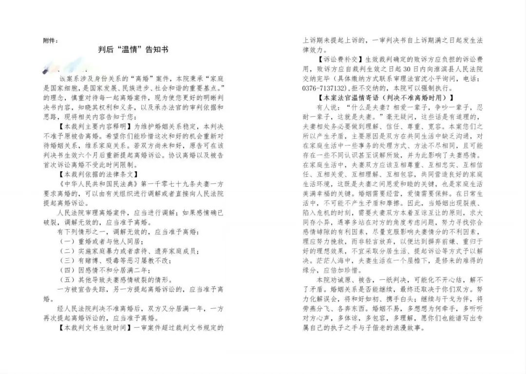 为切实践行司法为民的宗旨,聚焦群众在诉讼活动中的“急难愁盼”问题,进一步推动矛盾纠纷的实质化解,实现案结事了人和的良好效果,自2023年8月份开始,淮滨县法院马集法庭在民间借贷纠纷、离婚纠纷等多类型常见案件中推出《判后“温情”告知书》。在当事人收到一份判决书后,《判后“温情”告知书》以附件形式出现在文书后。