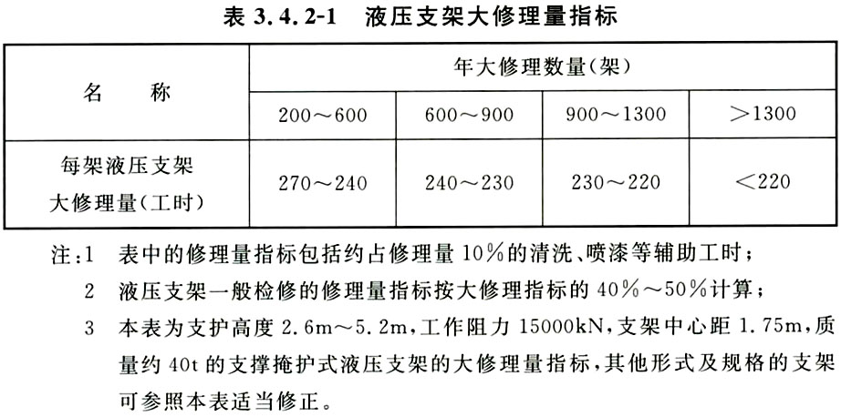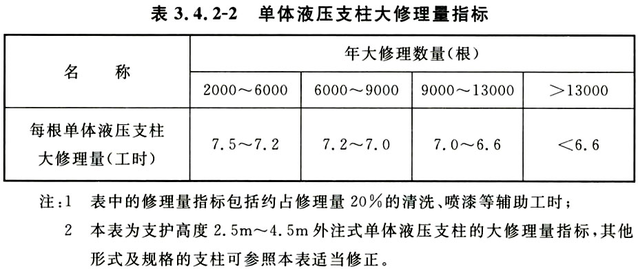 3.4.2液压支架大修理工人修理量指标不宜超过表3.4.2-1的规定,单体液压支柱大修理工人修理量指标不宜超过表3.4.2-2的规定。