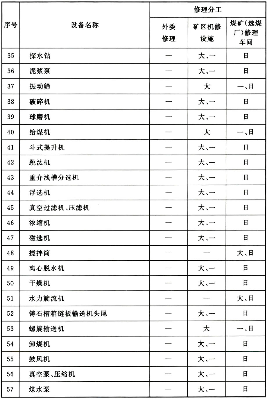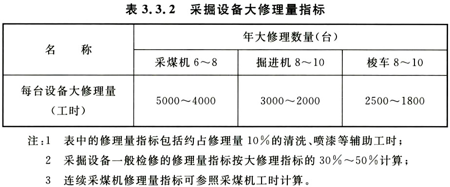 3.3.1釆掘设备宜釆用固定台位拆卸装配工作方式。每台釆煤机的大修理和一般检修在车间停留时间分别不宜超过90d和45d,每台掘进机和梭车大修理在车间停留时间不宜超过45d。