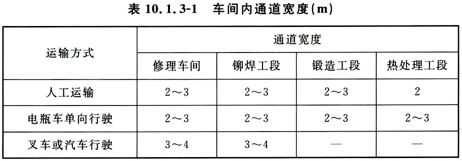 10.1.3表10.1.3-1车间内通道宽度参照现行国家标准《机械工程建设项目职业安全卫生设计规范》GB51155有关数据,并结合矿区机电设备修理设施的具体情况做出了适当调整。