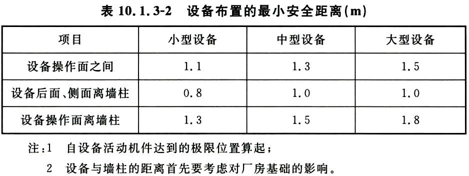 表10.1.3-2设备布置的最小安全距离,是按现行国家标准《机械工程建设项目职业安全卫生设计规范》GB51155的规定确定的。