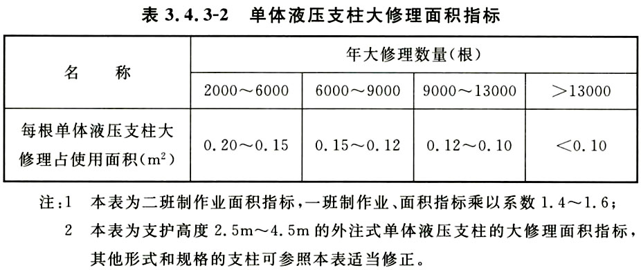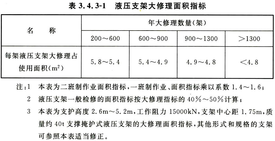 3.4.3液压支架大修理使用面积指标不宜超过表3.4.3-1的规定,单体液压支柱大修理使用面积指标不宜超过表3.4.3-2的规定。