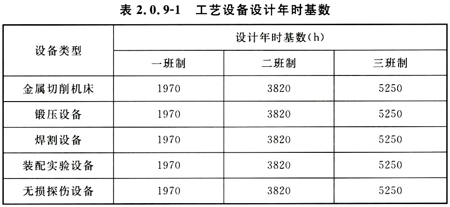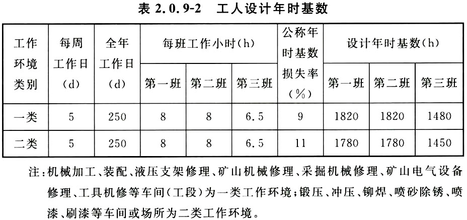 2.0.9矿区机电设备修理设施的工艺设备设计年时基数宜按表2.0.9-1确定,工人设计年时基数宜按表2.0.9-2确定。
