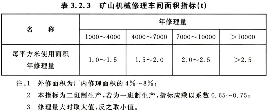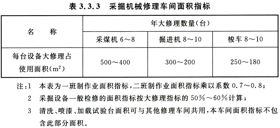 3.3.3车间使用面积应按计算的修理台位和工艺布置确定。金属切削机床可按每台占25m2~35m2计算,每台釆掘设备大修理使用面积指标不宜超过表3.3.3的规定。