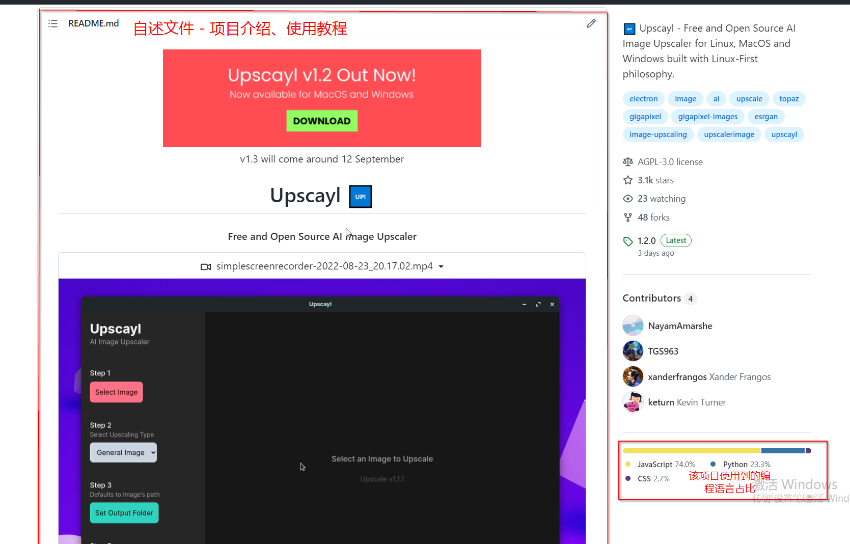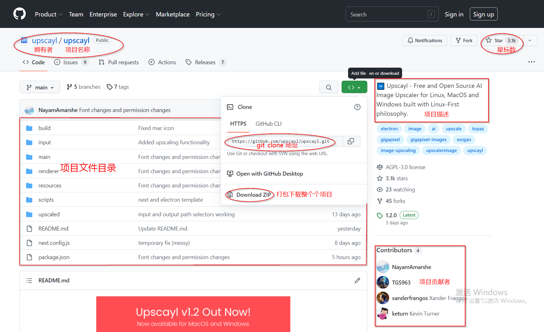 基本使用方法OK,现在我们随便进入一个开源项目,例如 upscayl 这个开源项目。