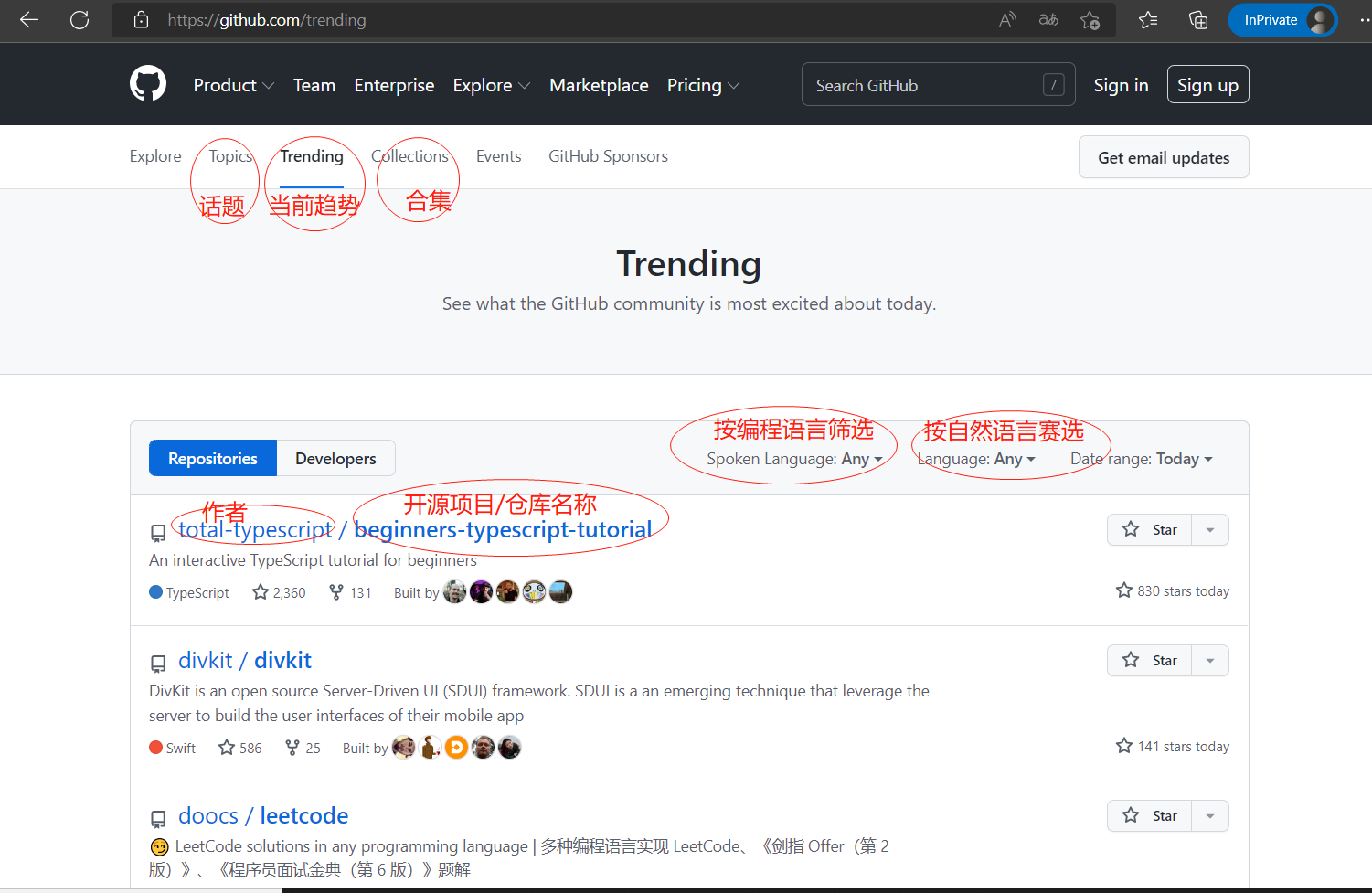 GitHub 功能很强大,但对于初学者来说我们只需要关注截图中的 “红圈部分” 就足够了, 下面我们将介绍如何在 GitHub 上快速检索我们需要的开源项目,以及如何使用这些开源项目。