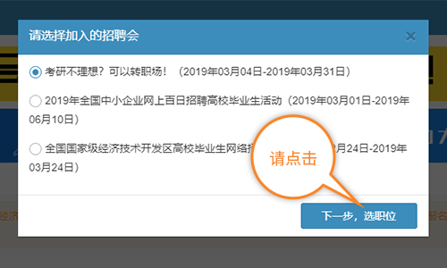 在弹窗中点选想要加入的招聘会后,点击“下一步,选职位”。
