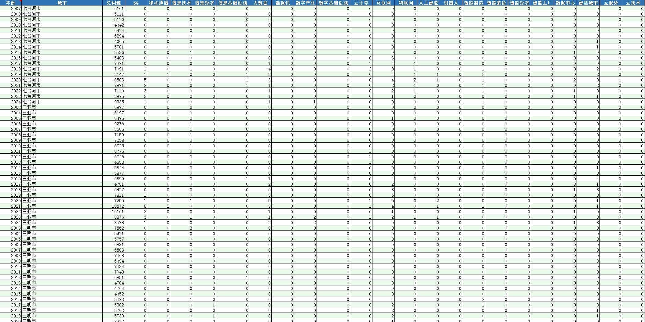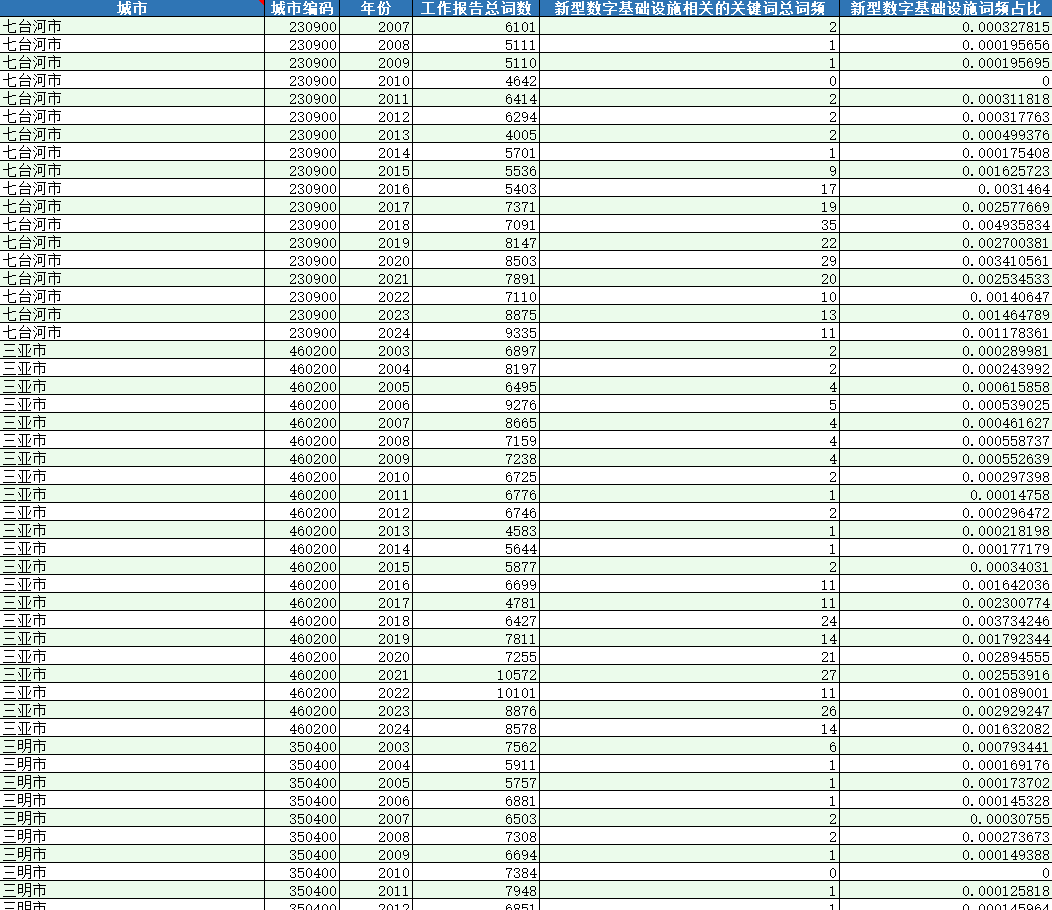 城市   城市编码   年份   工作报告总词数   新型数字基础设施相关的关键词总词频