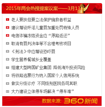 人民网北京3月13日电(记者赵艳红)13日,360新闻搜索提供的数据显示“两会热搜提案议案”的榜单中,“老人要扶但要立法保护施救者权益”、“建议增设奸淫儿童罪加重处罚特殊人员”等受到网友关注。