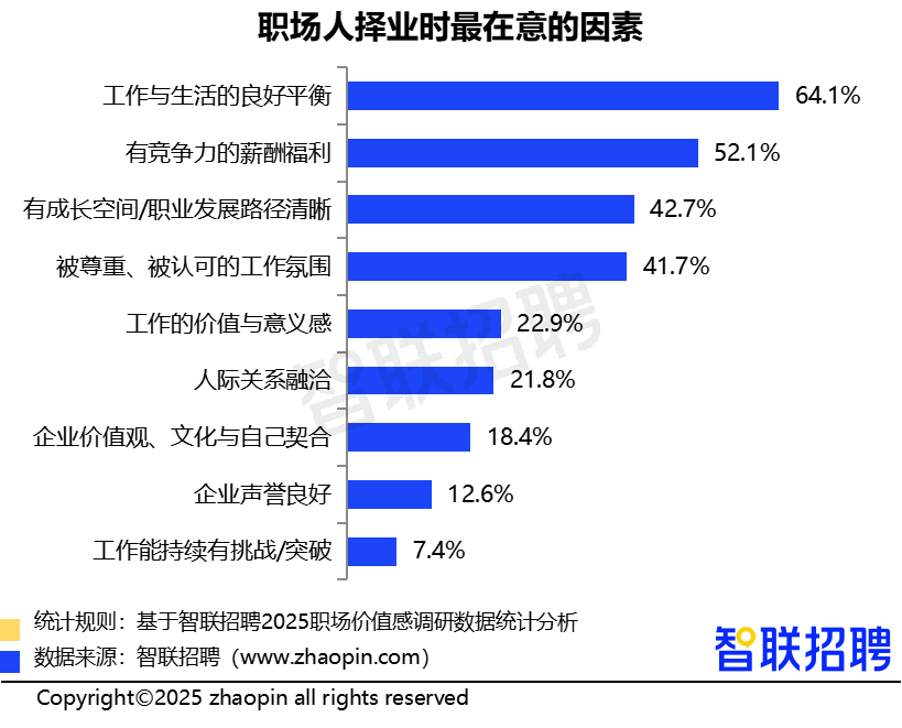 当“996”成为职场人渴望逃离的桎梏,当“反内卷”的呼声此起彼伏,越来越多职场人开始重新审视工作的意义。调研数据显示,64.1%的职场人选择工作时最在意的因素为“工作与生活的良好平衡”,首次排在了择业考量的第一位。这表明职场人更加关注工作能否保留充足的个人时间,不挤压生活空间,享有陪伴家人、发展兴趣与身心休憩的自由。